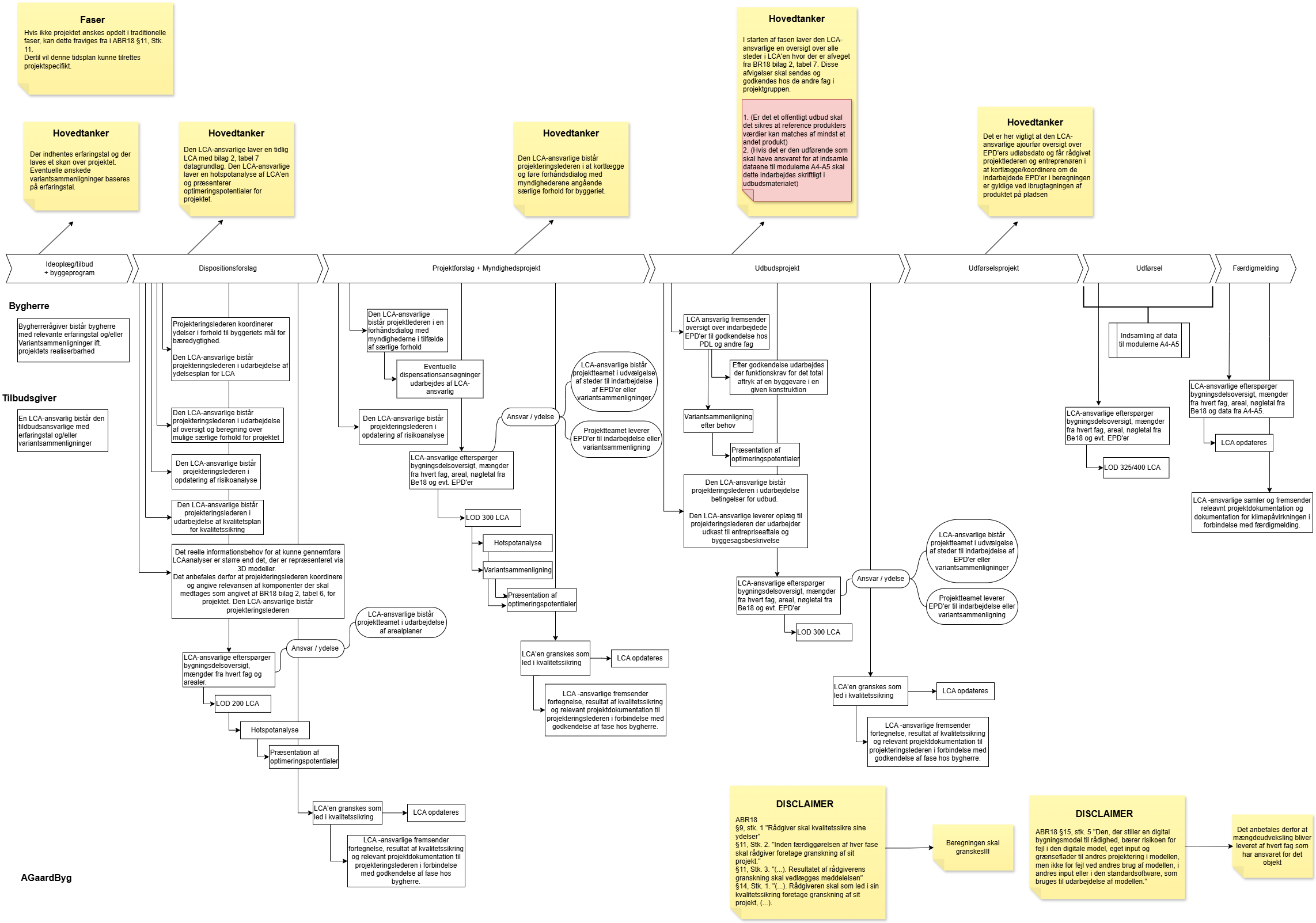 Nedenunder ses et Flowchart af alle mine noter, tanker og bemærkninger til, hvad jeg selv synes og hvad forskellige kilder som BR18, ABR18, YBL18, værdibyg og tillæg til YBL18 om bæredygtighed siger omkring LCA arbejdet igennem et projekts udarbejdelse. Det fokuserer hovedsageligt på et traditionelt forløb med faseopdelinger. Afhængigt af projektets natur vil der kunne sorteres lidt i det.